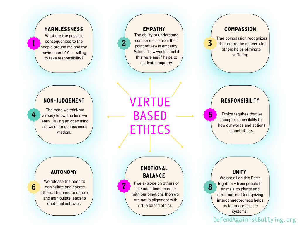 Virtue based ethics are not based on religions, self-serving judgements, or confirmation bias. Instead they are based on trustworthiness and focusing on the greater good for the group. The “greater good” is not determined by motivations to control, demean, or exploit anyone. It is determined by having an open heart which understands that we can make choices to heal society when we choose to align our intent to harmlessness and abundance.